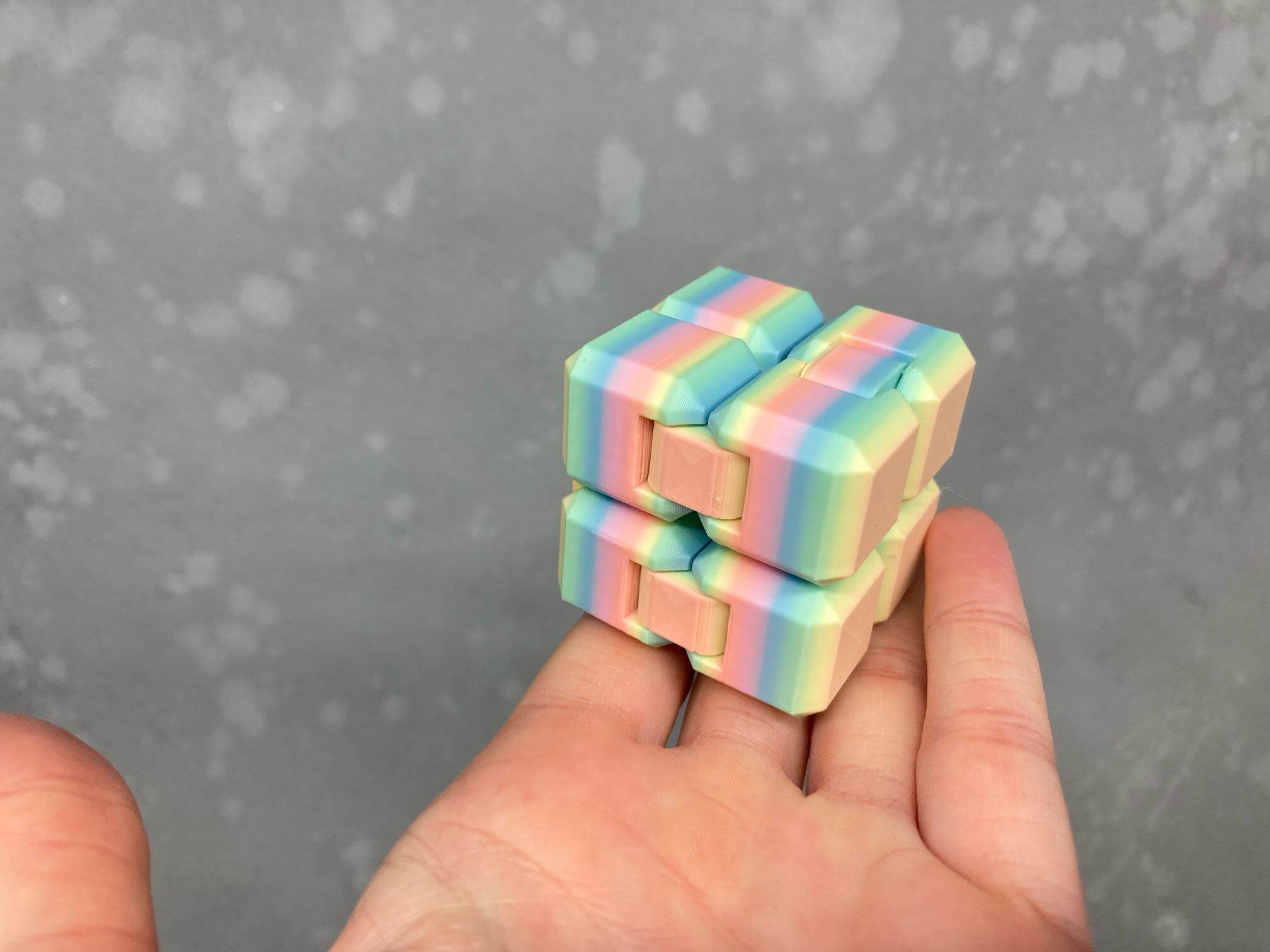 Folds infinitely on itself. PLA. Do not leave in super hot cars or outside in extreme weather. There’s always one side that will have some slight wonkiness on the hinge just because of how 3d printing works, but it doesn’t affect functionality or longevity. Joints may be tight when first received, but will loosen when fiddled with a bit. Colors will be dealer’s choice based on the provided color prompts.